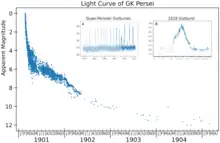 GK Persei (also Nova Persei 1901) was a bright nova first observed on Earth in 1901. It was discovered by Thomas David Anderson, an Edinburgh clergyman, at 02:40 UT on 22 February 1901 when it was at magnitude 2.7.[9][10] It reached a maximum magnitude of 0.2, the brightest nova of modern times until Nova Aquilae 1918. After fading into obscurity at about magnitude 12 to 13 during the early 20th century, GK Persei began displaying infrequent outbursts of 2 to 3 magnitudes (about 7 to 15 times quiescent brightness). Since about 1980, these outbursts have become quite regular, typically lasting about two months and occurring about every three years. Thus, GK Persei seems to have changed from a classical nova like Nova Aquilae 1918 to something resembling a typical dwarf nova-type cataclysmic variable star.