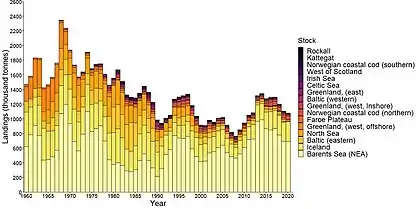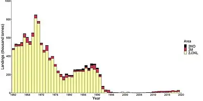 Atlantic cod has been targeted by humans for food for thousands of years,[41] and with the advent of modern fishing technology in the 1950s there was a rapid rise in landings.[42] Cod is caught using a variety of fishing gears including bottom trawls, demersal longlines, Danish seine, jigging and hand lines. The quantity of cod landed from fisheries has been recorded by many countries from around the 1950s and attempts have been made to reconstruct historical catches going back hundreds of years.[42] ICES and NAFO collects landings data, alongside other data, which is used to assess the status of the population against management objectives. The landings in the eastern Atlantic frequently exceeds 1 million tonnes annually from across 16 populations/management units with landings from the Northeast Atlantic cod population and Iceland accounting for the majority of the landings, Since 1992, when the cod moratorium took effect in Canada, landings in the western Atlantic have been considerably lower than in the eastern Atlantic, generally being less than 50,000 tonnes annually.