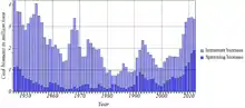 The stock of Northeast Arctic cod was more than four million tons following World War II, but declined to a historic minimum of 740,000 t (820,000 short tons) in 1983. The catch reached a historic maximum of 1,343,000 t (1,480,000 short tons) in 1956, and bottomed out at 212,000 t (234,000 short tons) in 1990. Since 2000, the spawning stock has increased quite quickly, helped by low fishing pressure. The total catch in 2012 was 754,131 t (831,287 short tons), the major fishers being Norway and Russia.[47]