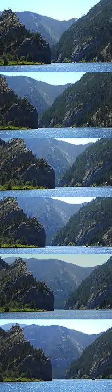 The prominent gray cliffs along the Missouri River in the Gates of the Mountains are formed by Madison Limestone. At the southern entrance to the canyon the trace of the Eldorado thrust fault juxtaposes Proterozoic Belt Supergroup Greyson Shale over much younger Madison Limestone; this faulting was part of the Sevier orogeny. Within the canyon, caves and folded layers of Madison Limestone are found. Near the north end of the canyon, at Mann Gulch and further north, alternating ridges and valleys reflect the alternating resistance of younger rock layers overlying the Madison Limestone. The entire canyon is an example of a superposed or antecedent stream, in which the river pre-dates the uplift of the rocks and kept pace with erosion as uplift occurred.[3]