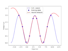 One application of machine learning is to perform regression from training data to build a correlation. In this example, deep learning generates a model from training data that is generated with the function . An artificial neural network with three layers is used for this example. The first layer is linear, the second layer has a hyperbolic tangent activation function, and the third layer is linear. The program produces parameter weights that minimize the sum of squared errors between the measured data points and the neural network predictions at those points. GEKKO uses gradient-based optimizers to determine the optimal weight values instead of standard methods such as backpropagation. The gradients are determined by automatic differentiation, similar to other popular packages. The problem is solved as a constrained optimization problem and is converged when the solver satisfies Karush–Kuhn–Tucker conditions. Using a gradient-based optimizer allows additional constraints that may be imposed with domain knowledge of the data or system.