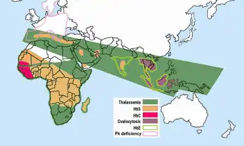 • Sickle cell – The gene for HbS associated with sickle-cell is today distributed widely throughout sub-Saharan Africa, the Middle East, and parts of the Indian subcontinent, where carrier frequencies range from 5–40% or more of the population. Frequencies of sickle-cell heterozygotes were 20–40% in malarious areas of Kenya, Uganda, and Tanzania. Later studies by many investigators filled in the picture.[15][16] High frequencies of the HbS gene are confined to a broad belt across Central Africa, but excluding most of Ethiopia and the East African highlands; this corresponds closely to areas of malaria transmission. Sickle-cell heterozygote frequencies up to 20% also occur in pockets of India and Greece that were formerly highly malarious.