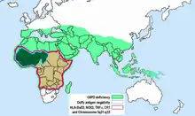 Plasmodium vivax has a wide distribution in tropical countries, but is absent or rare in a large region in West and Central Africa, as recently confirmed by PCR species typing.[51] This gap in distribution has been attributed to the lack of expression of the Duffy antigen receptor for chemokines (DARC) on the red cells of many sub-Saharan Africans. Duffy negative individuals are homozygous for a DARC allele, carrying a single nucleotide mutation (DARC 46 T → C), which impairs promoter activity by disrupting a binding site for the hGATA1 erythroid lineage transcription factor.[52] In widely cited in vitro and in vivo studies, Miller et al. reported that the Duffy blood group is the receptor for P. vivax and that the absence of the Duffy blood group on red cells is the resistance factor to P. vivax in persons of African descent.[5] This has become a well-known example of innate resistance to an infectious agent because of the absence of a receptor for the agent on target cells.