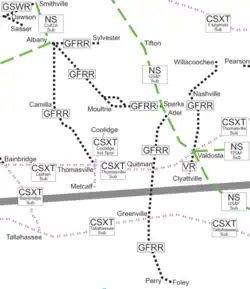 The Georgia and Florida Railway (reporting mark GFRR) is a short line railroad operating in Georgia and Florida, and is a subsidiary of OmniTRAX. The railroad spans 297 miles (478 km) over numerous different rail lines, most of which radiate out of Albany, Georgia.[1]