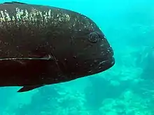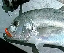 At sizes less than 50 cm, the giant trevally is a silvery-grey fish, with the head and upper body slightly darker in both sexes.[17] Fish greater than 50 cm show sexual dimorphism in their colouration, with males having dusky to jet-black bodies, while females are a much lighter coloured silvery-grey.[17] Individuals with darker dorsal colouration often also display striking silvery striations and markings on the upper part of their bodies, particularly their backs.[10] Black dots of a few millimetres in diameter may also be found scattered all over the body, although the coverage of these dots varies between widespread to none at all. All the fins are generally light grey to black, although fish taken from turbid waters often have yellowish fins, with the anal fin being the brightest.[15] The leading edges and tips of the anal and dorsal fins are generally lighter in colour than the main part of the fins. There is no black spot on the operculum.[12] Traces of broad cross-bands on the fish's sides are occasionally seen after death. The fishes have been known to prey and eat on the dead fish.[18]