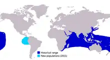 The giant trevally is widely distributed throughout the tropical and subtropical waters of the Bay of Bengal and Indian and Pacific Oceans, ranging along the coasts of three continents and many hundreds of smaller islands and archipelagos.[15] In the Indian Ocean, the species' westernmost range is the coast of continental Africa, being distributed from the southern tip of South Africa[19] north along the east African coastline to the Red Sea and Persian Gulf. Its range extends eastwards along the Asian coastline, including Pakistan, India and into Southeast Asia, the Indonesian Archipelago and northern Australia.[6] The southernmost record from the west coast of Australia comes from Rottnest Island,[20] not far offshore from Perth. Elsewhere in the Indian Ocean, the species has been recorded from hundreds of small island groups, including the Maldives, Seychelles, Madagascar and the Cocos (Keeling) Islands.[6]