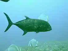 The giant trevally is a solitary fish once it reaches sexual maturity,[19] only schooling for the purposes of reproduction and more rarely for feeding.[21] Juveniles and subadults commonly school, both in marine and estuarine environments. Observations from South African estuaries indicate the schools of smaller juveniles tend not to intermingle with schools of other species, but larger subadults are known to form mixed-species schools with the brassy trevally.[35] Research has been conducted on the movements of larger fish around their habitats, as well as the movement between habitats as the species grows, to understand how marine reserves impact on the species. Adult giant trevally are known to range back and forth up to 9 km along a home range, with some evidence of diel and seasonal shifts in habitat use.[25] In the Hawaiian Islands, giant trevally do not normally move between atolls, but have specific core areas where they spend most their time. Within these core areas, habitat shifts during different times of the day have been recorded, with the fish being most active at dawn and dusk, and usually shifting location near sunrise or sunset.[25] Furthermore, large seasonal migrations appear to occur for the purpose of aggregating for spawning, with this also known from the Solomon Islands.[37] Despite not moving between atolls, they do make periodic atoll-wide journeys of up to 29 km.[25] Long-term studies show juveniles can move up to 70 km away from their protected habitats to outer reefs and atolls.[23] The giant trevally is one of the most important apex predators in its habitats, both as adults on reefs and as juveniles in estuaries.[34] Observations in relatively untouched waters of the northwestern Hawaiian Islands showed the giant trevally was of high ecological importance, constituting 71% of the apex predator biomass, and was the dominant apex predator. This number is considerably less in heavily fished Hawaiian waters.[38] The species is prey to sharks, especially when small. Conversely, adult giant trevallies, either singles or pairs, have been recorded attacking sharks (like blacktip reef shark) by ramming them repeatedly with their head. The shark, sometimes even larger than the trevally, may die from the attack. The reason for this behavior is unclear, but the giant trevally does not attempt to eat the dead shark. Rarely, they have been recorded behaving in the same way towards humans: A spearfisher in Hawaii broke three ribs when rammed by a giant trevally.[39][40] Large giant trevallies have been recorded as a host of the sharksucker, Echeneis naucrates, a fish which is normally seen attached to the undersides of sharks.[41]