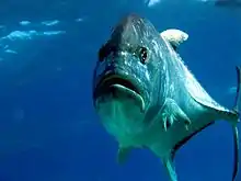 Frontal view of a giant trevally illustrating the compressed form of the species