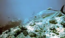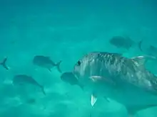 The giant trevally is a powerful predatory fish, from the estuaries it inhabits as a juvenile to the outer reefs and atolls it patrols as an adult.[21][22] Hunting appears to occur at different times of the day in different areas of its range; off South Africa it is most active during the day, especially at dawn and dusk,[19] while off Zanzibar and Hong Kong, it is nocturnal in its habits.[42][43] The species' diets have been determined in several countries and habitats; their diets generally vary slightly by locations and age. In all but one study (which was of juveniles), the giant trevally dominantly takes other fishes, with various crustaceans, cephalopods and occasionally molluscs making the remainder of the diet.[11][44] In Hawaii, the species has a predominantly fish-based diet consisting of Scaridae and Labridae, with crustaceans, including lobsters, and cephalopods (squid and octopus) making up the remaining portion. The large number of reef fishes suggests it spends much of its time foraging over shallow-water reef habitats, but the presence of squid and the schooling carangid Decapterus macarellus indicates exploitation of more open-water habitats, as well.[21] Off Africa, the diet is similar, consisting mostly of fish including eels, with minor squid, octopus, mantis shrimp, lobsters and other crustaceans.[42] Younger fish inside Kaneohe Bay, Hawaii showed the only instance where crustaceans were preferred over fish; stomatopods, shrimp and crabs were the most common prey taken at 89% of stomach content by volume, with fish, mostly of the family Blennidae, making up only 7% of the stomach contents.[26] Estuarine fish in both Hawaii and Australia have mostly fish-based diets, with crustaceans such as prawns and amphipods also of importance, and they are known to take more novel prey, such as spiders and insects, in these habitats.[22][45] Juvenile turtles and dolphins were reported being found within the stomach contents of larger giant trevally.[46] Studies of different size classes of fish have found their diets change with age in some locations, with the changes relating to an increased volume of fish taken.[35]