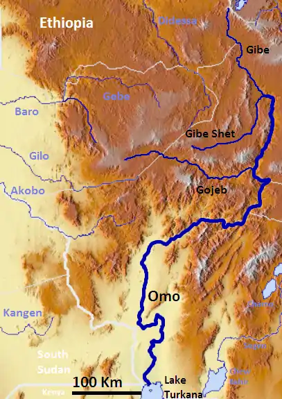 The Gibe River (also Great Gibe River) is by far the largest tributary of the Omo River in southwestern Ethiopia and flows generally south-southeast. The confluence of the Gibe River 8°19′N 37°28′E / 8.317°N 37.467°E with the smaller Wabe River form the Omo River. The whole drainage basin is sometimes referred to as the Omo-Gibe River Basin with the Gibe and the Omo draining the (respectively) upper and lower reaches.
