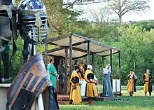 The minimum standard for attendance at an SCA event is "an attempt at pre-17th century clothing",[19] and there is a general goal of maintaining a historical atmosphere. However, SCA members will use modern elements when necessary for personal comfort, medical needs, or to promote safety (e.g. wearing prescription eye-wear, using rattan for swords or shear thickening substances for padding). Unlike some other living history groups, most SCA gatherings do not reenact a specific time or place in history, leaving members free to dress as any culture within the SCA's time period.[20][21]