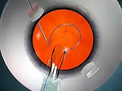 No-Assistant technique – This technique works on the principle of vector forces and was first performed by Priya Narang.[7][8][9] In this technique, after the externalization of the leading haptic, the trailing haptic is flexed beyond the pupillary plane, towards the 6 o'clock position. This reverses the direction of vector forces and causes the leading haptic to extrude more from the previous sclerotomy site, thereby preventing haptic slippage and its subsequent complications.
