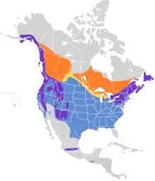 Range map of the golden-crowned kinglet. The breeding range is highlighted in orange, the migration range in yellow, the non-breeding range in blue, and the year-round range in purple.