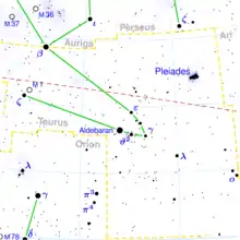 Star map with the Pleiades (upper right) and the Hyades (centre, V-shaped head of the constellation Taurus with its main star Aldebaran, γ Tauri und ε Tauri (Ain)) at both sides of the ecliptic line (dashed red).