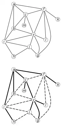 A plane graph (top), a good spanning tree of (down) solid edges are part of good spanning tree and dotted edges are non-tree edges in with respect to .