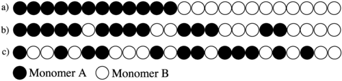Figure 1: Example of a (a) diblock copolymer, (b) gradient copolymer and (c) random copolymer