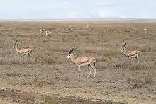 Grant's gazelles are generally mixed feeders that both browse and graze. In one study, their diet consisted of 66% browse and 34% graze.[17] Rainfall seems to be a determinant of their diets.[17] One way the Grant's gazelle withstands dehydration and heat stress is by being very efficient in digesting dry matter. Grant's gazelles consume a smaller amount of food than domesticated animals, but they are better-suited for extreme environments because they derive protein from forage more quickly.[18] The Grant's gazelle's diet may be responsible for the slow growth rates of browsed plants.[19] They get most of their moisture from the plants they eat, so they do not often have to drink water. Thus they can stay on the plains long after the rains end. In dry seasons, gazelles move deep into dense brush and wait for the next rains.[13] They will eat red oat grass and small, tough plants,[20] which are avoided by the other ungulates. This allows the gazelles to survive in the brush during the dry season. Grant's gazelles eat mainly dicotyledons during the dry season and grass in the wet season.[21]