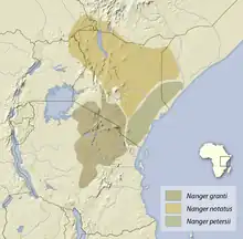 Grant's gazelle is genetically related to Soemmerring's gazelle (N. soemmerringii) and Thomson's gazelle (Eudorcas thomsonii) with Soemmering's gazelle being the closer relative.[3] Grant's gazelle shows high genetic variation among its populations, although there is no geographic isolation. The differentiation of the species may have evolved during repeated expansion and contraction of arid habitats during the late Pleistocene era in which populations were possibly isolated.[3] Grant's gazelle was formerly considered a member of the genus Gazella within the subgenus Nanger before Nanger was elevated to genus status. In 2021, the American Society of Mammalogists granted full species status to Bright's gazelle (Nanger notatus) and the Peter's gazelle (Nanger petersii).[6][7]