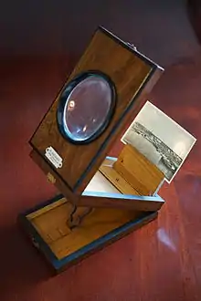 A graphoscope was a 19th-century device used in parlors in order to enhance the viewing of photographs and text. The graphoscope is supposed to be based on a 1864 patent of Charles John Rowsell.[1] These novelty items consisted of a single magnifying glass, often in a wooden frame, in an overall construction that could collapse into a compact rectangular form. A photo/card holder was usually also included. A KOMBI camera often had included in its design a graphoscope for better film viewing. Many devices combined a Stereoscope and Graphoscope.