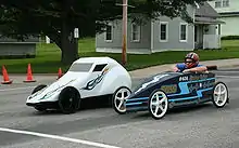 In the UK, gravity racer derbies have recently become more popular, brought to the masses by large events such as the Red Bull Soapbox Race and that held between 2000 and 2004 at the Goodwood Festival of Speed. Now, many small hilly communities organize their own races, such as the Catterline Cartie Challenge in Scotland and the Belchford Downhill Challenge in Lincolnshire, and there are now several dozen known races across the UK.[4] An annual Soap Box Derby has taken place in mid-July at Richard's Castle on the Shropshire/Herefordshire border since 2004.[5][6] In addition to the local community races, there are a small number of races which attract more serious competitors, such as Cairngorm Soapbox Extreme (held at Cairn Gorm from 2009 to 2012) and the Worlaby Downhill Challenge. These races tend to produce higher speeds than the community races. Gravity racers taking part in Cairngorm Soapbox Extreme in 2011 reached speeds of 70 mph.[7]