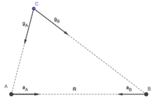 Consider two point masses and at locations and , with mass and respectively. The distance separates the two objects. Given a massless third point at location , one can ask whether to use a frame centered on or on to analyse the dynamics of .