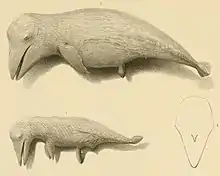 The gray whale was first described as a distinct species by Lilljeborg 1861 based on a subfossil found in the brackish Baltic Sea, apparently a specimen from the now extinct north Atlantic population. Lilljeborg, however, identified it as "Balaenoptera robusta", a species of rorqual.[32] Gray 1864 realized that the rib and scapula of the specimen was different from those of any known rorquals, and therefore erected a new genus for it, Eschrichtius.[33] Van Beneden & Gervais 1868 were convinced that the bones described by Lilljeborg could not belong to a living species but that they were similar to fossils that Van Beneden had described from the harbour of Antwerp (most of his named species are now considered nomina dubia) and therefore named the gray whale Plesiocetus robustus, reducing Lilljeborg's and Gray's names to synonyms.[34]