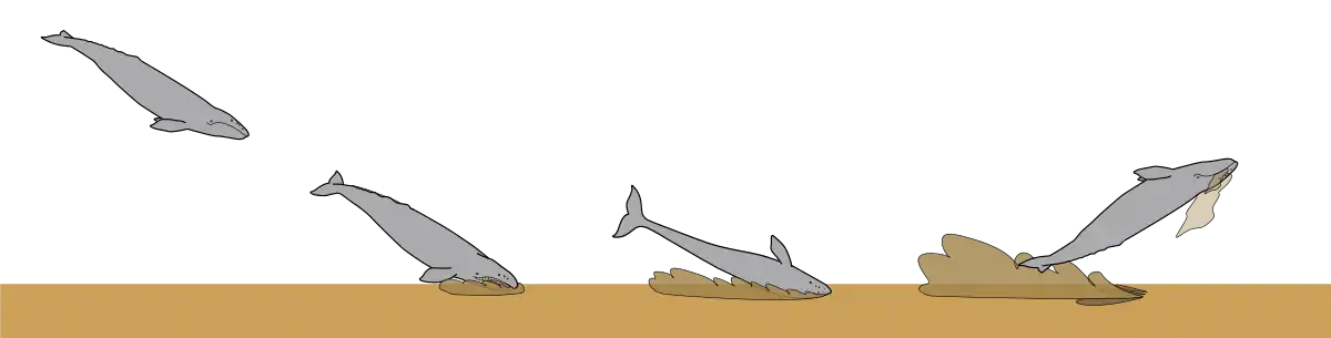 Gray whales feed benthically, by diving to the ocean floor and rolling on to their side, (gray whales, like blue whales seem to favor rolling onto their right side) and suck up prey from the sea floor.[89] Gray whales seem to favor feeding planktonically in their feeding grounds, but benthically along their migration route in shallower water.[90] Mostly, the animal feeds in the northern waters during the summer; and opportunistically feeds during its migration, depending primarily on its extensive fat reserves. Another reason for this opportunistic feeding may be the result of population increases, resulting in the whales taking advantage of whatever prey is available, due to increased competition.[91] Feeding areas during migration seem to include the Gulf of California, Monterey Bay and Baja California Sur.[92] Calf gray whales drink 50–80 lb (23–36 kg) of their mothers' 53% fat milk per day.[93]