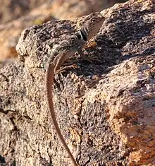 The Great Basin collared lizard (Crotaphytus bicinctores), also known commonly as the desert collared lizard or the Mojave black-collared lizard, is a species of lizard in the family Crotaphytidae. The species is endemic to the Western United States.