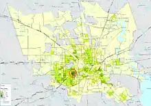 The size of the city blocks in Gulfton differs significantly from that of Downtown Houston in that sixteen downtown city blocks will fit into one Gulfton block. Few sidewalks exist in Gulfton.[36] In 1999 Houston City Council District F representative Ray Discroll said "[Gulfton residents] don't have sidewalks, let alone sidewalks that are only two and a half feet wide. There are pregnant women walking down the sides of the roads."[39] In 2005 the Houston-Galveston Area Council identified Gulfton as one of the most hazardous communities for pedestrians.[40] Dug Begley of the Chronicle wrote in 2019 that "pedestrians and cyclists, [sic] navigate streets designed for cars that can leave residents facing wide intersections with fast, unimpeded right turns and signal timing that forces younger, elderly and disabled travelers to hustle, as hundreds of cars pass by."[41] That year the organization Together for Safer Roads planned to fund a study on Hillcroft Road, discussing ways of making pedestrians there safer, with $150,000; it plans to work with the municipal government.[41]