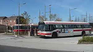 A small building provides washroom facilities for TTC operators. There is a platform and upgraded new design shelter[5] for people waiting for streetcars,[4] while bus passengers have a regular bus shelter.