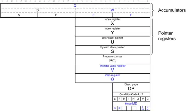 • Two 8-bit accumulators: 'E' and 'F'. These can be concatenated to form 16-bit accumulator 'W'. The existing 6809 16-bit accumulator D can be concatenated with W to form 32-bit accumulator 'Q'. It is likely that D is short for 'Double' and Q for 'Quad', the number of bytes they hold.
