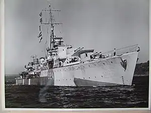 In August 1944, Huron returned to Canada to undergo a refit at Halifax, Nova Scotia. She returned to UK waters in November 1944, carrying out escort duties in the Western Approaches. In March 1945, she was transferred to the Home Fleet for screening duties, traveling from Scapa Flow and the River Clyde. On 16 April 1945, Huron sailed for Murmansk on one final Arctic convoy to the Soviet Union, returning to Scapa Flow on 6 May 1945.[10][26] On the return convoy to Scapa Flow, the last convoy battle of the European war takes place. The convoy is attacked by German U-boats, with one member of the escort, HMS Goodall being sunk.[27] Huron, Haida and the cruiser HMS Berwick departed Scapa Flow for Trondheim, Norway, calling in fjords with relief supplies. Upon reaching Trondheim, the Allied units take over custody of surrendered U-boats. Huron returned to Greenock, Scotland on 24 April 1945.[26][28] In May 1945 she returned to Canada. She began a tropicalization refit to prepare her for possible service in the southern Pacific Ocean. However, this was cancelled due to the surrender of Japan.[11] Following the end of the war, she was decommissioned into the reserve on 9 March 1946.[10][11]