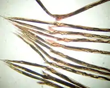 Haemonchus contortus, also known as the barber's pole worm, is a very common parasite and one of the most pathogenic nematodes of ruminants. Adult worms attach to abomasal mucosa and feed on the blood. This parasite is responsible for anemia, oedema, and death of infected sheep and goats, mainly during summer in warm, humid climates.[2]
