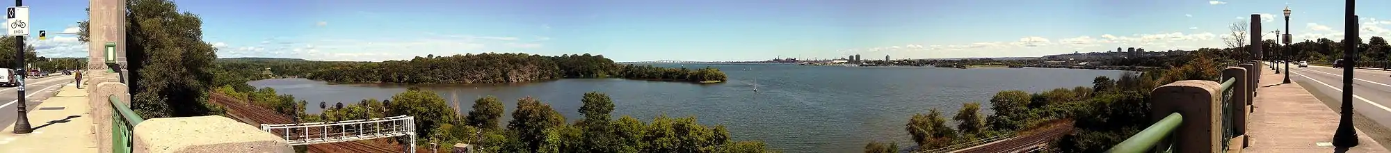 Panoramic view of Hamilton Harbour from T.B. McQuesten High Level Bridge on York Boulevard, near Harvey Park.