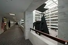 The atrium is dominated by the sculptural work Mountains and Clouds by Alexander Calder. The upper part of the work consists of a mobile, "Clouds", made from curved aluminum plates suspended from the roof on a shaft.[35] The largest section of the mobile measures roughly 43 by 32 feet (13.1 by 9.8 m),[36] and the entire mobile weighs about 4,300 pounds (2,000 kg).[37][38] Crystallization Systems, Inc. of New York manufactured the mobile.[39][40] A computer-controlled motor moves the mobile.[36][40]