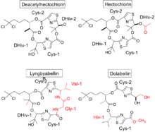 Currently in the MarinLit database, other compounds (besides deacetylhectochlorin and hectochlorin) that contain this fairly unusual gem-dichloro group are lyngbyabellin A-N, 27-deoxylyngbyabellin A and dolabellin, all of those synthesized from Moorea species. Most lyngbyabellins also contain DHIV in their structure, as well as dolabellin. Figure 2 compares the structures of deacetylhectochlorin, hectochlorin, lyngbyabellin B and dolabellin. This figure illustrates the similarities (black) and differences (red) between those compounds compared to deacetylhectochlorin. All of those compounds (but hectochlorin) do not have a proposed biosynthesis published.