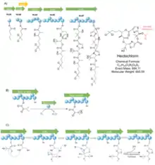 Figure1. A) Predicted biosynthesis of hectochlorin. B) P450 oxidation of side chain. C)Formation of thiazole ring