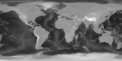 Height map of planet earth at 2km per pixel, including oceanic bathymetry information, normalized as 8-bit grayscale