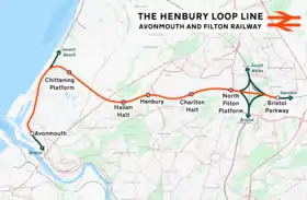The Henbury Loop Line, also known as the Filton to Avonmouth Line, is a railway line following the boundary between Bristol and South Gloucestershire between the Severn Beach Line at Hallen Marsh Junction, Avonmouth and the Cross Country Route/South Wales Main Line at Filton. It is currently only used for freight.