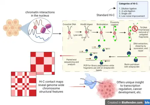 Hi-C (or standard Hi-C) is a high-throughput genomic and epigenomic technique first described in 2009 by Lieberman-Aiden et al. to capture chromatin conformation.[1] In general, Hi-C is considered as a derivative of a series of chromosome conformation capture technologies, including but not limited to 3C (chromosome conformation capture), 4C (chromosome conformation capture-on-chip/circular chromosome conformation capture), and 5C (chromosome conformation capture carbon copy).[1][2][3][4] Hi-C comprehensively detects genome-wide chromatin interactions in the cell nucleus by combining 3C and next-generation sequencing (NGS) approaches and has been considered as a qualitative leap in C-technology (chromosome conformation capture-based technologies) development and the beginning of 3D genomics.[2][3][4]
