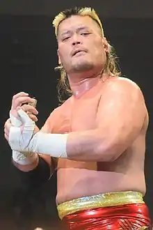 Hiroyoshi Yamamoto (山本 広吉, Yamamoto Hiroyoshi, born March 23, 1971)[1][5] is a Japanese professional wrestler who currently works for New Japan Pro-Wrestling, and is better known by his ring name Hiroyoshi Tenzan (天山 広吉, Tenzan Hiroyoshi). With Satoshi Kojima, in 2008, they won the World's Strongest Tag Determination League in All Japan Pro Wrestling and the G1 Tag League in NJPW, becoming the only tag team which has done both. He is a four-time IWGP Heavyweight Champion and a record twelve-time IWGP Tag Team Champion. He is also a former National Wrestling Alliance (NWA) World Heavyweight Champion.