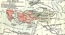 The failure of Lucius Licinius Lucullus to rid Rome once and for all of Mithridates brought a lot of opposition back at home, some fueled by the great Roman consul Pompey. A threat by pirates on the Roman food supply in the Aegean Sea brought Pompey once again to the forefront of Roman politics, and he drove them back to Cilicia. The powers granted Pompey after this success allowed him to not only throw back Mithridates all the way to the Bosphorus, but made neighboring Armenia a client kingdom. In the end, Mithridates committed suicide in 63 BCE, and therefore allowed Rome to add Pontus as a protectorate along with Cilicia as a Roman province.[4] This left only Galatia, Pisidia and Cappadocia, all ruled by Amyntas in whole, as the last remaining kingdom not under a protectorate or provincial status. However, in 25 BCE, Amyntas died while pursuing enemies in the Taurus mountains, and Rome claimed his lands as a province, leaving Anatolia completely in Roman hands.[28]
