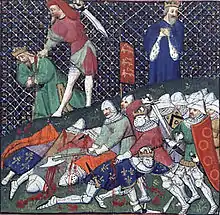 The Protestant Reformation, inspired in France mainly by John Calvin, began to challenge the legitimacy and rituals of the Catholic Church.[26] French King Henry II severely persecuted Protestants under the Edict of Chateaubriand (1551).[27] Renewed Catholic reaction — headed by the powerful Francis, Duke of Guise — led to a massacre of Huguenots at Vassy in 1562, starting the first of the French Wars of Religion, during which English, German, and Spanish forces intervened on the side of rival Protestant ("Huguenot") and Catholic forces.