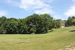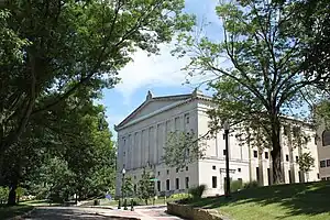 With the opening of the Kent Free Library in 1892, Kent became the first municipality in Ohio to take advantage of a new state law which allowed municipalities with populations under 5,000 to tax residents for the upkeep of a library.[27] In 1903, the library moved to its current location on West Main Street in a building that was financed by a $10,000 USD ($351,760 present-day) gift from Andrew Carnegie. Carnegie donated the money on the condition residents provided a site and $1,000 USD ($35,176 present-day) per year for maintenance. The levy passed overwhelmingly[28] on September 17, 1901 and the site was donated by Marvin Kent. Although additions have been made throughout the years, the original library building still stands today and currently houses the library's genealogy and local history areas. Most recently, all previous additions were demolished and a new, three-story addition was constructed which tripled the previous amount of available space. This new addition opened on September 26, 2006, exactly 103 years after the original library opened.[29]