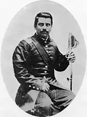 New Mexico at first accepted the United States' military occupation without resistance, but within a year of Kearney's annexation of the territory, there was a widescale uprising.[41] Nuevomexicano Pablo Montoya and Taos Puebloan Tomás Romero together led the 1847 Taos Revolt, which resulted in the execution of Charles Bent, Taos sheriff Stephen Lee, Judge Cornelio Vigil, Bent's brother-in-law Pablo Jaramillo, the attorney J. W. Leal, and a young boy named Narciso Beaubien.[42] The U.S. military moved quickly to quash the revolt, and the fighting ended in New Mexico after the Nuevomexicanos' subsequent defeats in the Battle of Red River Canyon, the Battle of Las Vegas, and the Battle of Cienega Creek.