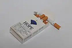 Hope is a long-selling product familiar with the names of "Short Hope" and "Shoppa" (it is the official product name to put the number of entries per package in parentheses). There was a Hope brand with a similar name which was introduced in 1931 and existed until September 1940, after Emperor Hirohito forbade any foreign-named brands, Hope was relaunched in 1957, but it is not related to the pre-war Hope.[3] It is the counterpart to Peace cigarettes[4][5][6]