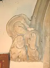 The Church of England parish church of Saint Giles seems to have been built late in the 12th century. The Early English Gothic[7] south aisle, including the south door and three and a half bay south arcade date from this period. From this time the east wall of the chancel had a trio of three stepped lancet windows. The early Decorated Gothic south transept was added late in the 13th or early in the 14th century[7] as a chantry chapel. The south porch was added late in the 14th century.[3] Around 1400 the present west tower and tower arch were built. The tower arch features two unusual almost life-size sculptures of human figures: one playing the bagpipes and the other showing an expression of amazement.[7] Also in the 15th century the pitch of the nave roof was greatly reduced in typical Perpendicular Gothic style.[7] Late in the 15th century, Perpendicular Gothic windows were inserted in both sides of the chancel and the north wall of the nave. The Perpendicular Gothic piscinae in the chancel and south transept are also 15th century.[3]