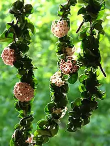 A variant of Hoya, Hoya carnosa var. compacta, is known as the Hindu rope plant, and is characterized by its folded, curled leaves, which grow along vines resembling ropes. The inflorescences of this variant tend to take on a pinkish color.