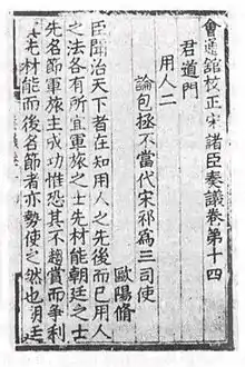 For creating movable type font characters, the Chinese employed both methods of either casting moulds or individually engraving characters.[11] Casting was favored over the long and laborious process of cutting individual characters of bronze, which may have been a simple task with the material of wood, but not as economically feasible with metal that could be simply cast instead.[12] However, for traditional Chinese metal movable type printing, some records of the 18th century indicate that individual engraving and cutting was used as well.[13] While creating new books using movable type, ink was applied to a plate and rubbed with paper as seen in woodblock printing.[13] Then there was the process of assembling and setting the type, and ultimately distributing it, which necessitated at least a small level of division of labor.[13] In fact, there are books printed in the Ming and Qing periods that designated the lists of workers who contributed to the printing, publication, and distribution of the books themselves.[13] The bronze-type edition of the Song dynasty encyclopedia Tai Ping Yu Lan printed in 1547 AD, in the city of Jianyang, described how two persons were responsible for typesetting while two others were in charge of the actual printing.[13] For books that do not indicate in the initial pages whether they were printed using movable type instead of woodblock printing, there are definite signs that can be examined to deduce which method was used. Misprints, misalignment of characters, and uneven spacing are the distinct mark of many movable type editions from the time of Hua Sui.[14] However, as time progressed and the works of printers such as Hua Jian, An Guo, and others were made, steps were made to perfect the process and thus making it harder to differentiate between woodblock printing editions and movable type editions (unless noted in the text).[14]