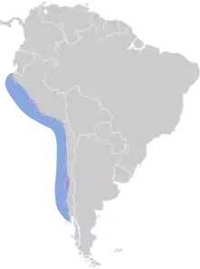 The Humboldt penguin's breeding distribution ranges from southern Chile along the dry and arid coastal regions of the Atacama Desert to subtropical Isla Foca in north Peru. Its range is restricted to the coast and offshore islands affected by the Humboldt current, which provides a continuous supply of nutrients and food, thus supporting huge populations of seabird.[22] In Chile, the most important breeding colony is at Isla Chañaral.[18]